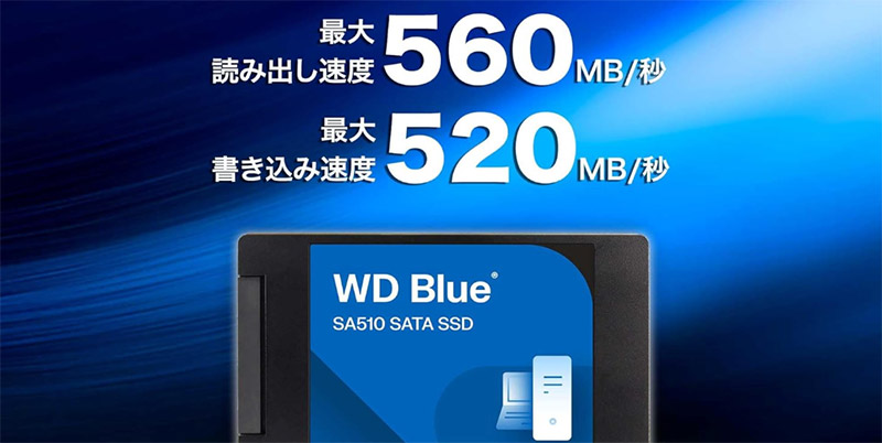 | WD Blue SA510 | 560MB/s | 520MB/s | 5年 | ダントツの安心感 | そのまま交換するだけ |
