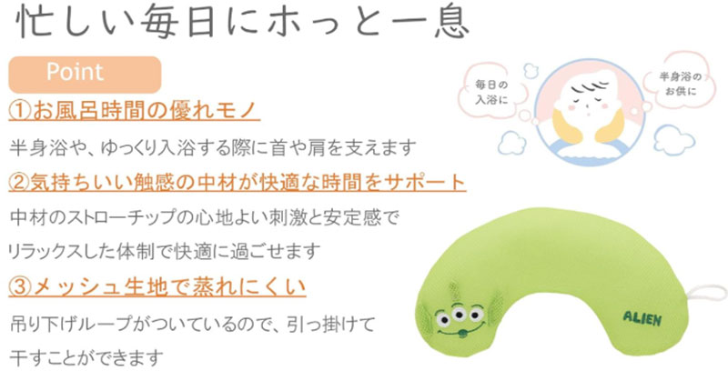使い終わったらバスピローをしっかり水洗いして、風通しの良い場所で乾かしてください。 浴室に置きっぱなしにするとカビの原因になるので注意が必要です。 定期的に中性洗剤で洗うと清潔に保てます。 特に夏場は雑菌が繁殖しやすいので念入りにお手入れしましょう。