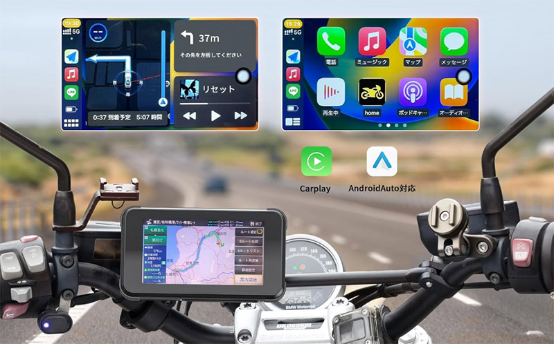 5インチは250ccでも大型でも違和感なく収まるサイズで、日中でも反射が少なく見やすいIPS液晶でした。CarPlayとAndroid Autoの両対応、無線でスマホと繋がる、取り付けもUボルト式で済むのが推せるポイント。
