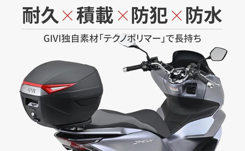 イタリアの大手GIVIが作る30Lのモノロックシリーズで、原付2種〜250ccに合わせやすいサイズ感。 赤いトップパネルが思った以上にカッコよく、休日のカフェ前に停めても画になりました。