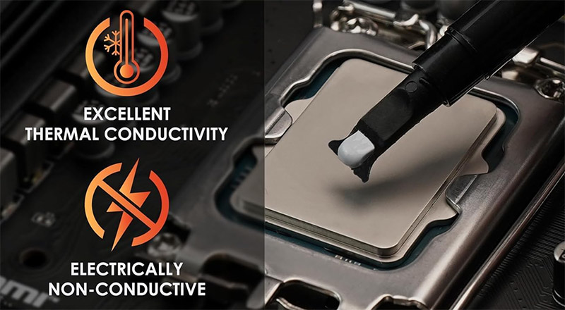 非導電性なので基板にはみ出してもショートの心配がありません。 粘度がやや高めなので塗り広げるときにコツがいりますが、中央にちょんと置いてクーラーで押し広げる方法ならキレイに伸びます。 欠点は1gで1000円前後とやはり高価なこと。 でも冷却性能を考えると、このくらいの投資は十分アリです。