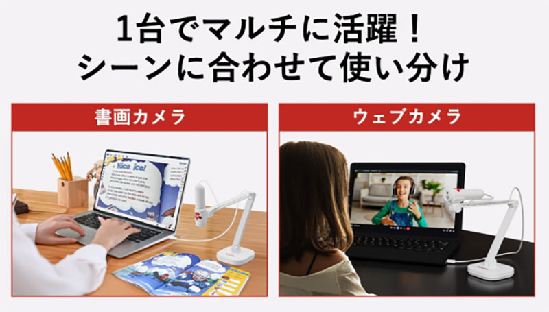 普通のWebカメラとの違いは「真上から手元を撮れる」こと。資料の細かい数式や、子どもの鉛筆の動きまで鮮明に映せるので、教育現場や在宅ワークで急速に普及しています。