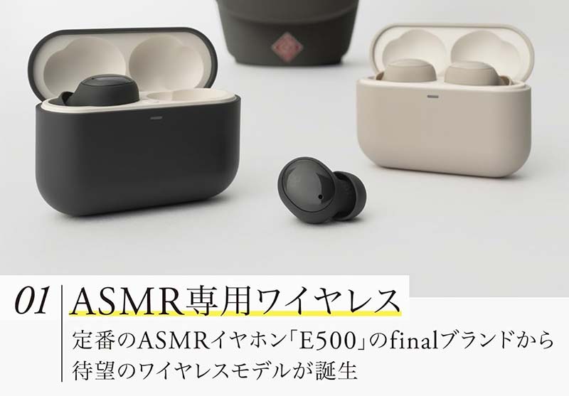 finalがASMR専用に開発したワイヤレスイヤホンです。 有線モデルE500の開発チームが再集結し、長時間のASMR視聴に最適化したチューニングが施されています。