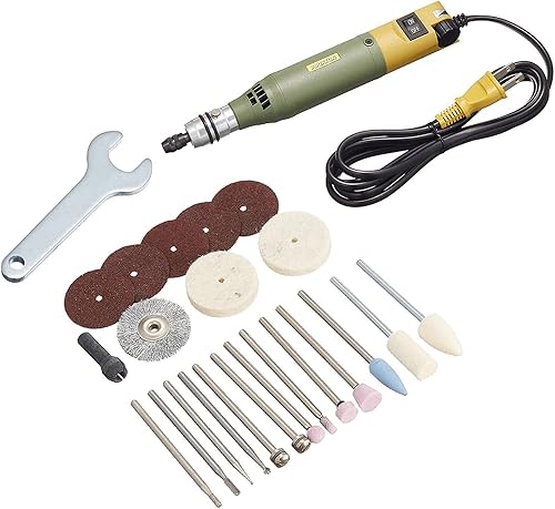 プロクソンのMM100は、ホビー用リューターの定番中の定番です。初心者から上級者まで、幅広く愛用されています。40000RPMの高速回転により、精密な加工が可能です。トルクも十分で、樹脂製フィギュアパーツから、プラスチック、木製パーツまで、様々な素材に対応できます。付属アクセサリーが充実しており、購入してすぐに各種加工が始められるのが特徴です。セット内容も、フィギュア制作に必要な基本的なビットが揃っており、別途購入の手間が最小限に済みます。長年の販売実績があり、信頼性も高いことで知られています。ドイツ製の高品質工具として国際的な評価も高いです。