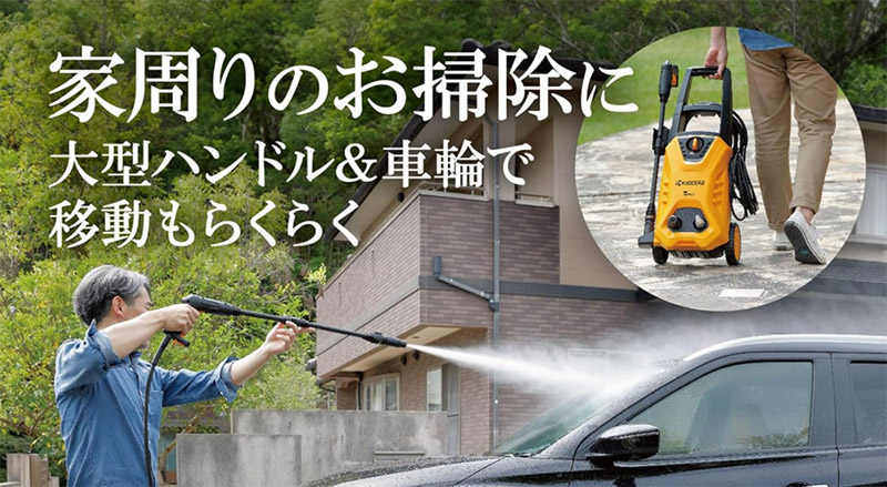 旧リョービブランドの信頼感がそのまま残っている京セラの高圧洗浄機です。 16mの高圧ホースが標準で付いてくるので、戸建ての2階ベランダから地上のカーポートまで届く長さがあります。