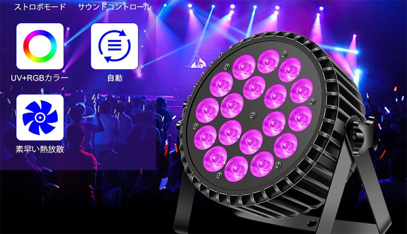 18個×10WのパワフルLEDにUV(ブラックライト)まで搭載した一台。 ハロウィンや蛍光塗料を使った演出にも対応できる、遊び心のある装備が魅力です。