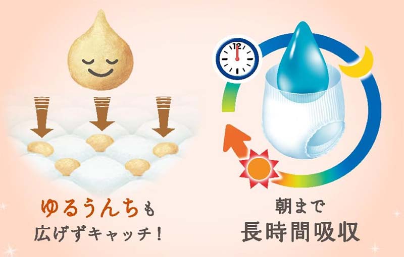ウエスト部分がよく伸びるので、大きくなったお子さんでも履かせやすく脱がせやすい設計です。 おしっこをたっぷり吸収できるので、夜間の使用にも対応できます。