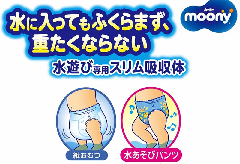 ユニ・チャームのムーニー水あそびパンツは、水の中でも膨らまず、赤ちゃんが動きやすいスリム設計が特徴です。 ピンクとブルーの2色展開で、男女どちらにも使えます。