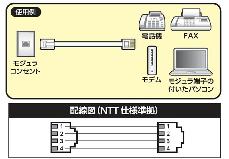 6極4芯なのでビジネスフォンや一部のFAX複合機にも対応します。
