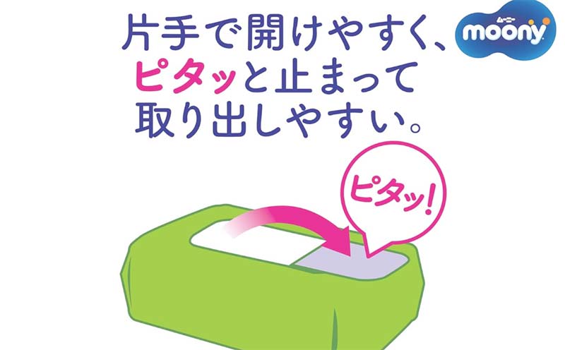 通常のムーニーおしりふきよりもシートの肌触りがなめらかで、拭いたときの引っかかりが少ないのが特徴です。