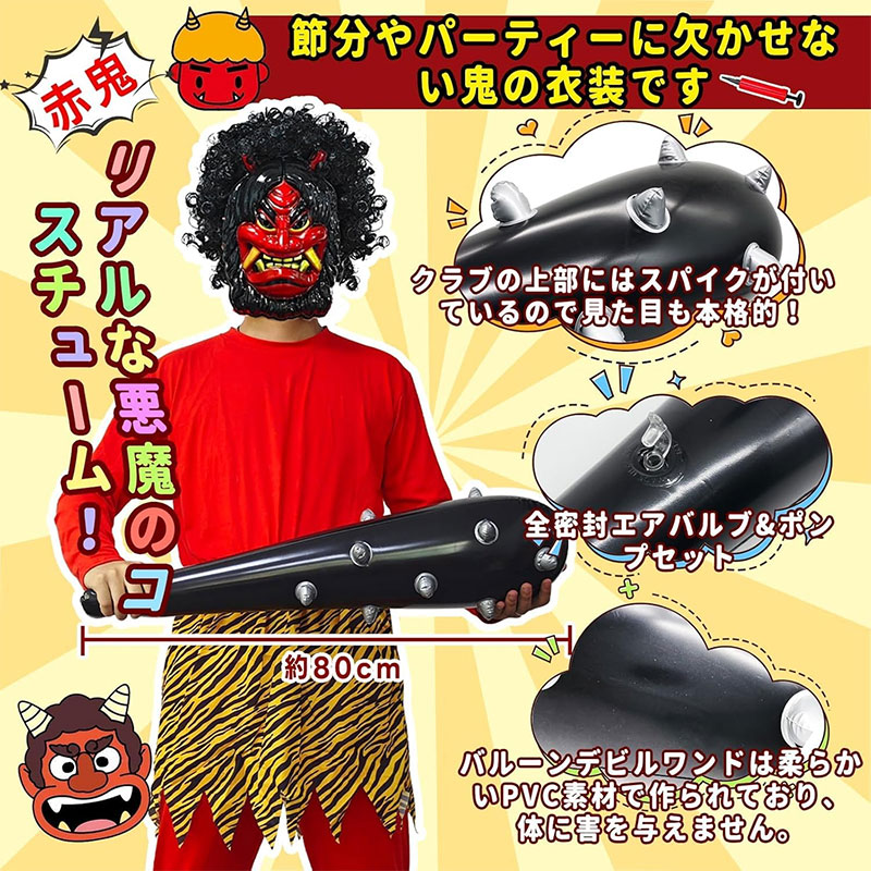 こん棒は膨らませた状態で長さ85cmとボリュームがあり、見た目のインパクトも十分です。ご自宅でのお子さんとの豆まきはもちろん、幼稚園、保育園、児童養護施設、小学校などの行事やイベントでも大活躍します。男女共用で家族みんなで楽しめるのも魅力です。