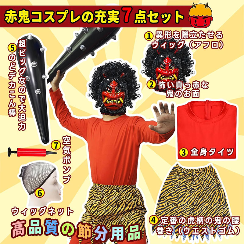第2位は、インパクト抜群のムキムキ鬼コスチュームです。送風ファンで膨らむ風船型の衣装で、超立体的なマッチョ鬼に変身できます。お面と金棒もセットになっていて、パーティーやイベントで注目されること間違いなしです。