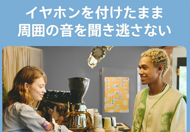 アクティブノイズキャンセリング機能付きなので、電車やカフェなどの騒がしい場所でも快適に音楽を楽しめます。 外音取り込みモードも搭載で、会話のときもイヤホンを外す必要がありません。