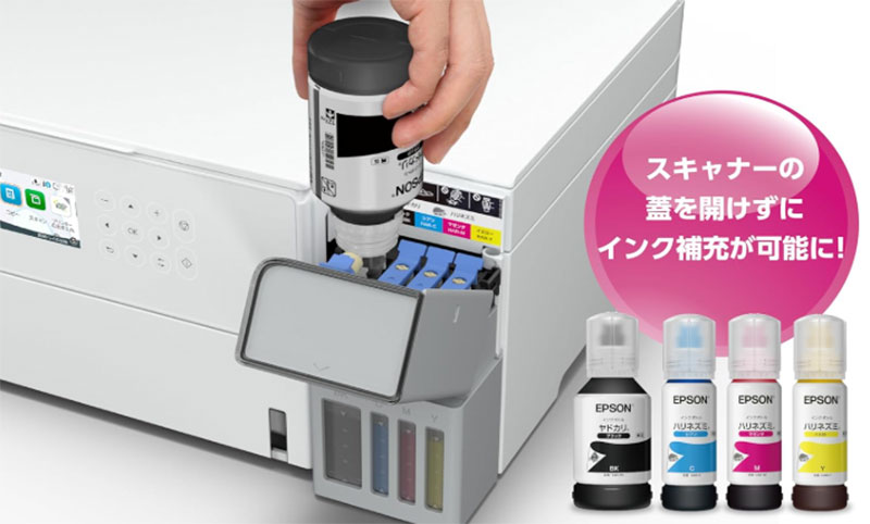 インクタンク式プリンターのインク補充はとても簡単です。 ボトルのキャップを開けてタンクの注入口にセットするだけで、自動的に適量が注入される仕組みになっています。