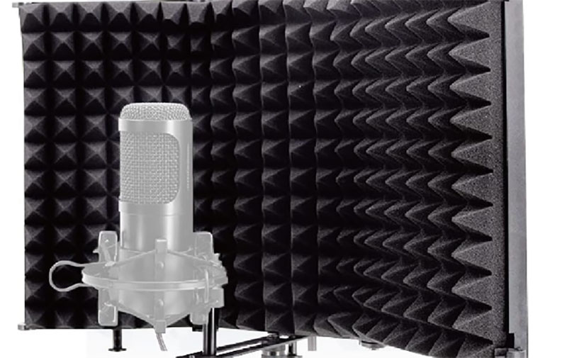五つ折りタイプで、広げるとかなり大きな面積をカバーできます。 マイクの左右まで覆えるので、横からの反射音も拾いにくくなります。