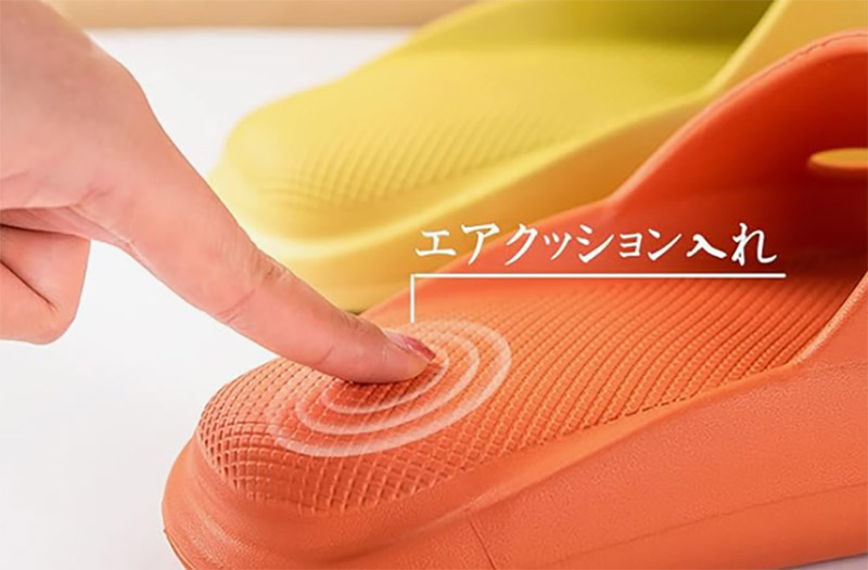 底の厚みが4cmもあるエアクッション系スリッパ。 キッチンに長く立つ日も、足裏から膝にくる負担感がずいぶん減ります。 筆者は立ち仕事の日にこれを履いて、夜のふくらはぎのハリが半分くらいになりました。