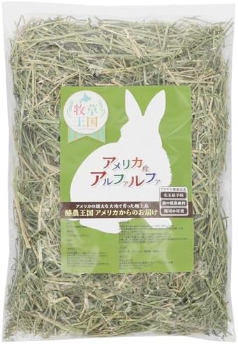 たんぱく質が豊富で、成長期の子うさぎや妊娠中・授乳中のお母さんうさぎの栄養補給に最適です。ハイペットは小動物用品の老舗メーカーで、品質の安定感には定評があります。葉と茎のバランスが良く、食べ応えもあるので歯の健康維持にも貢献してくれます。チモシーに混ぜて与えれば、牧草を食べる楽しみが増えてうさぎの食生活が豊かになります。