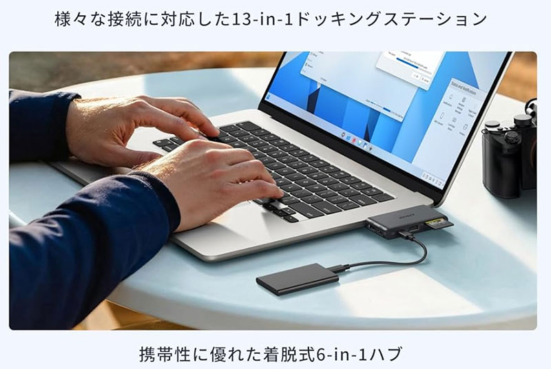 Ankerの2025年新モデルで、13ポートを搭載した高機能ドッキングステーションです。USB-Cケーブルが着脱式になっているため、断線しても交換できるのが地味にうれしいポイントです。